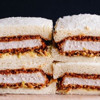 Üzerine kaplanmış ekmek dilimlerinden birini düz olarak yerleştirin, daha sonra her iki tarafa da katsu sosuyla kaplanmış kızartılmış wagyuyu, (bonfile) üstüne ince dilimli etleri yerleştirin ve son olarak dilim ekmekle kaplayın. Daha sonra kenarları kesip ikiye bölün.