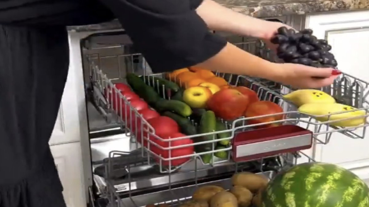 Videoda, kadının meyve ve sebzeleri özenle bulaşık makinesine dizdiği ve makineyi çalıştırdığı görülüyor. Kadın, bu yöntemle yiyeceklerini temizlemeyi daha pratik bulduğunu belirtiyor.