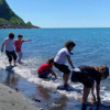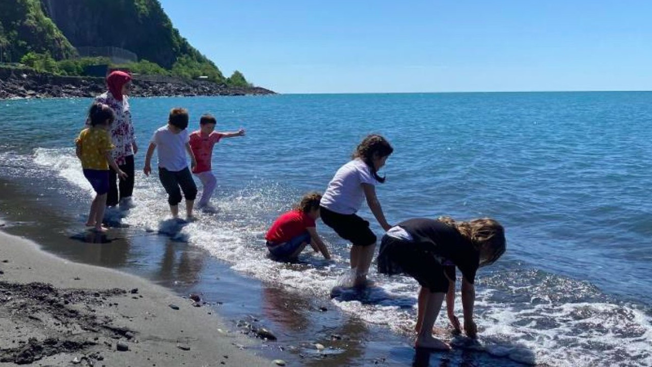 Hopa merkez Kopmuş Halk Plajı'na varan minik öğrenciler, burada hayatlarında ilk kez denizle buluştu. Denizin serin sularına ayaklarını sokan çocuklar, sahilde yürümenin ve taşlarla oynamanın keyfini doyasıya çıkardı. Güneşin ve denizin tadını çıkaran öğrenciler, neşe dolu anlar yaşadı.