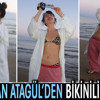 Atagül, leopar desenli bikinisiyle sabahın 5'inde kumsalda verdiği pozları Instagram sayfasında takipçileriyle paylaştı.