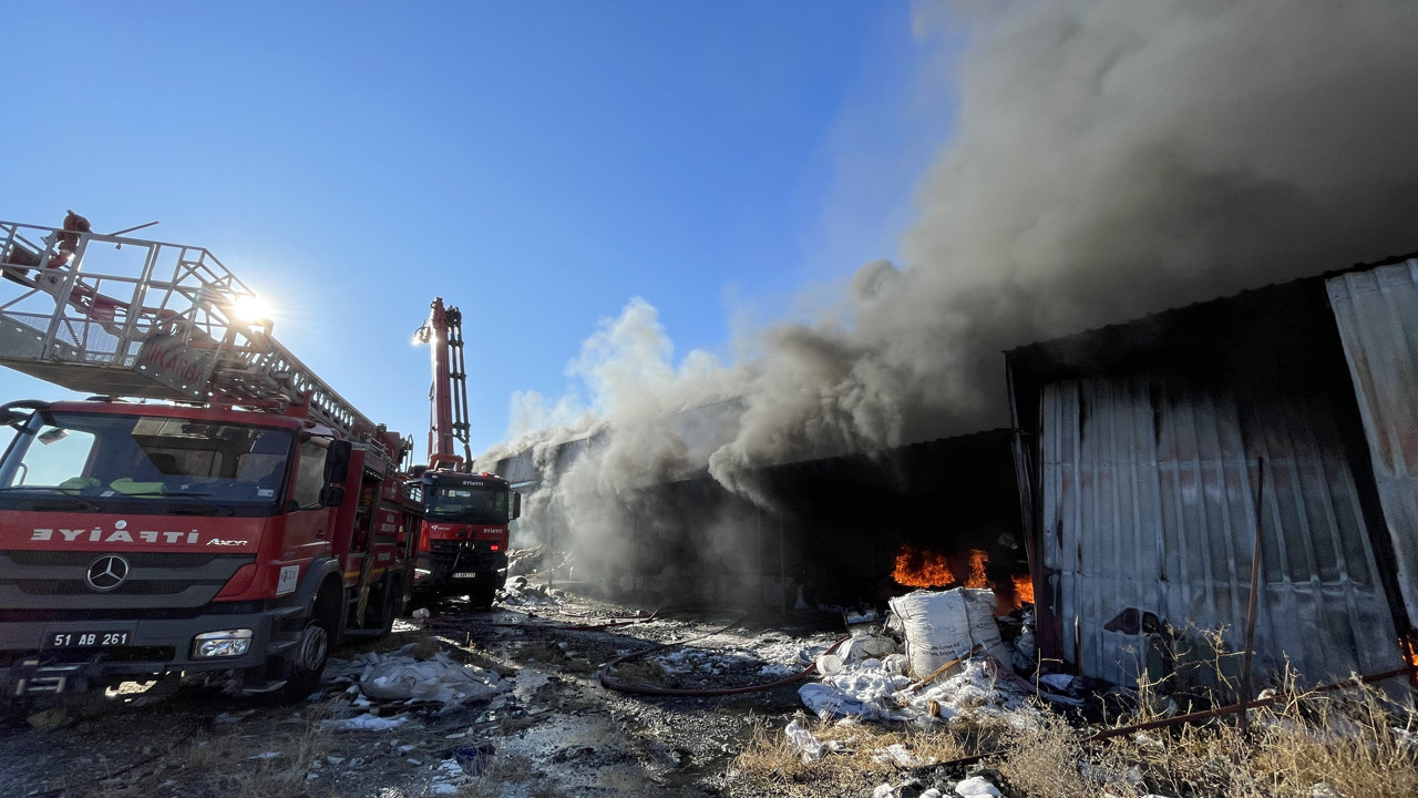 Niğde Organize Sanayi Bölgesinde plastik çerçeve fabrikasında çıkan yangına müdahale ediliyor.