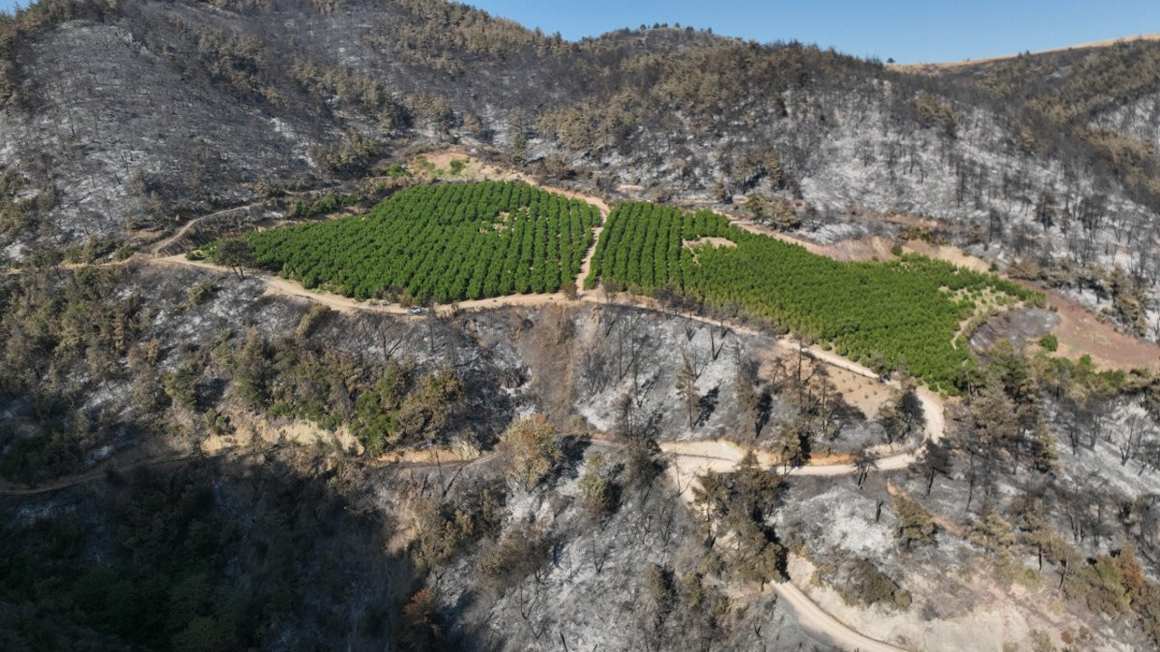 Hayatın normale dönmesiyle birlikte köylülerin geçim kaynağı olan tarım alanlarındaki bir bahçesi ise dikkat çekti. 100 hektarlık ormanlık alandaki ağaçların hepsi küle dönerken, ormanın içinde Karahıdır Mahallesinde kalan nektarin bahçesi yemyeşil üzerinde meyveleriyle kala kaldı.