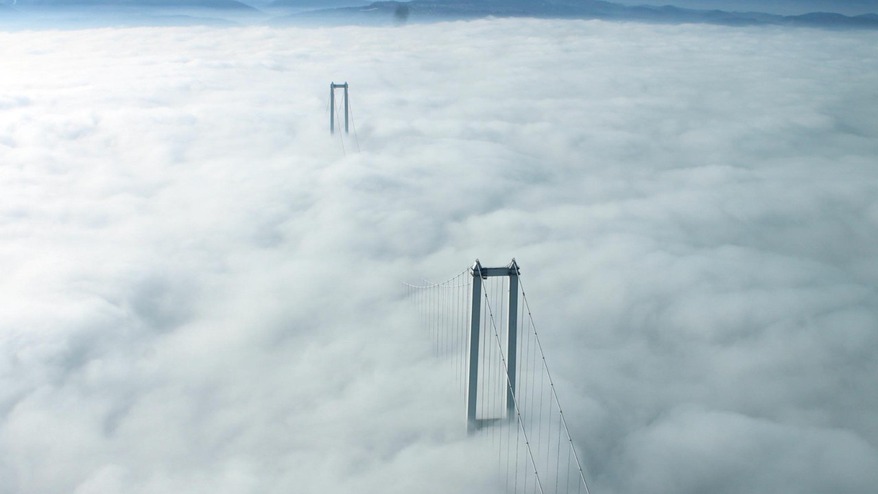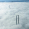 Havadan görüntülenen köprü sis nedeniyle sadece üst kısımları gözüktü.