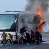 Bu sırda sürücü otobüsü sağ şeride çekerek içinde bulunan 22 yolcuyu tahliye etti. Bölgeye polis, jandarma ve itfaiye ekipleri sevk edildi.