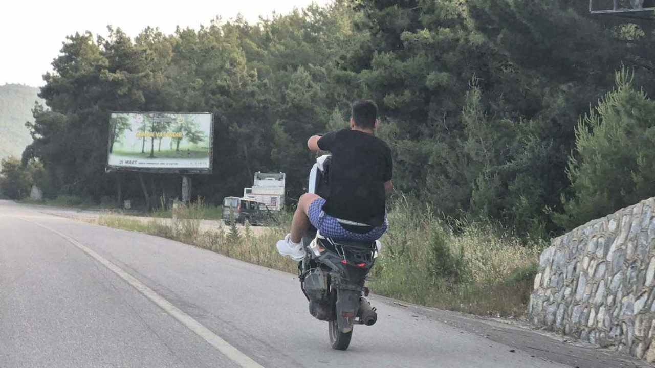 Olay, dün akşam saatlerinde Milas-Bodrum kara yolu Güvercinlik istikametinde meydana geldi. Emniyet şeridinde plakasız motosikletinin ön tekerini kaldırarak ilerleyen kasksız sürücü hem kendini hem de diğer araç sürücülerini tehlikeye attı.