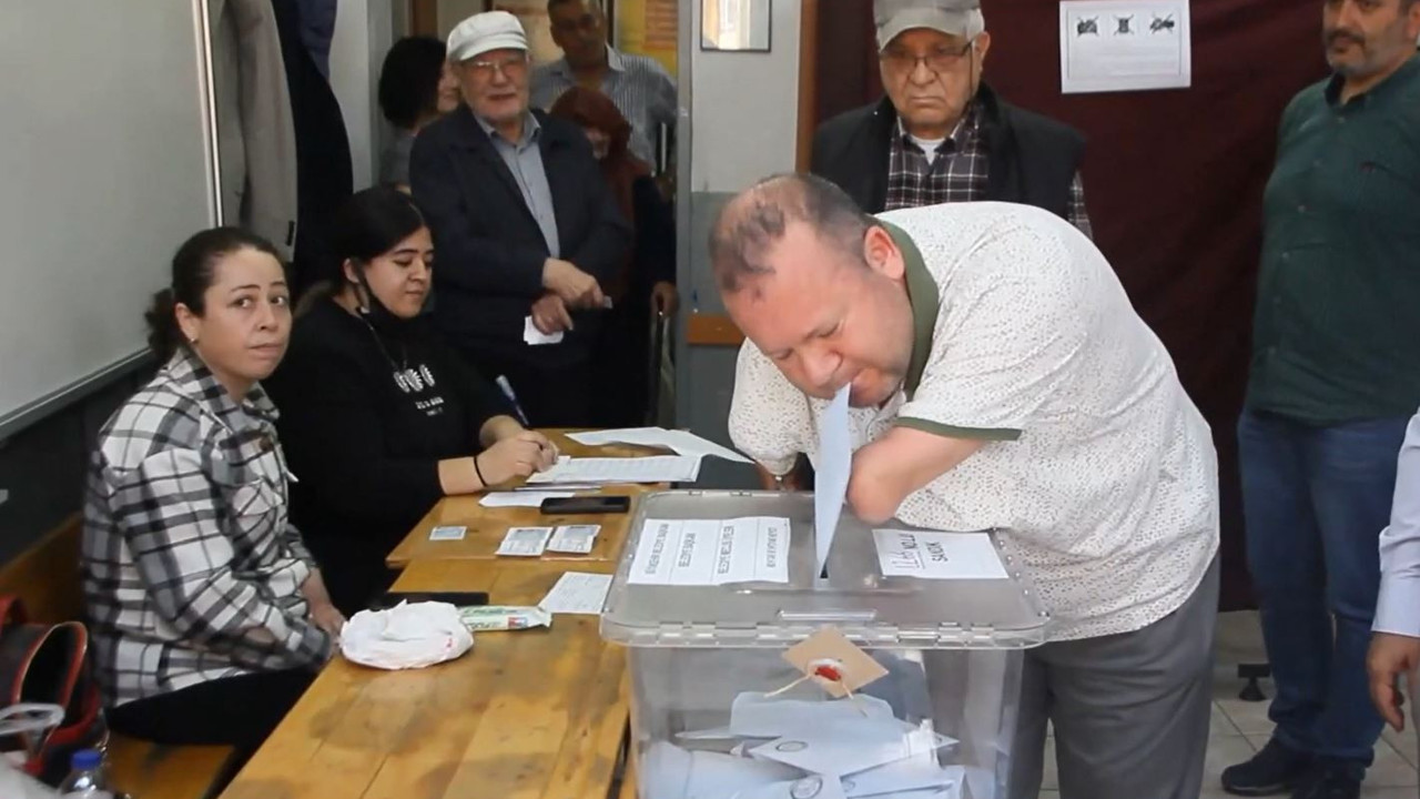 Yıllar önce elektrik çarpması sonucunda iki kolunu kaybeden 45 yaşındaki Bülent Bodur, eşiyle birlikte geldiği okul binasında bulunan 1266 numaralı sandıkta oyunu kullandı.