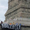 Üstünde "dik dur ve diren" yazılı bir tişört giyen siyahi kadın, Özgürlük Anıtı üstündeki eylemini üç saat sürdürdükten sonra polisler tarafından gözaltına alındı.