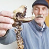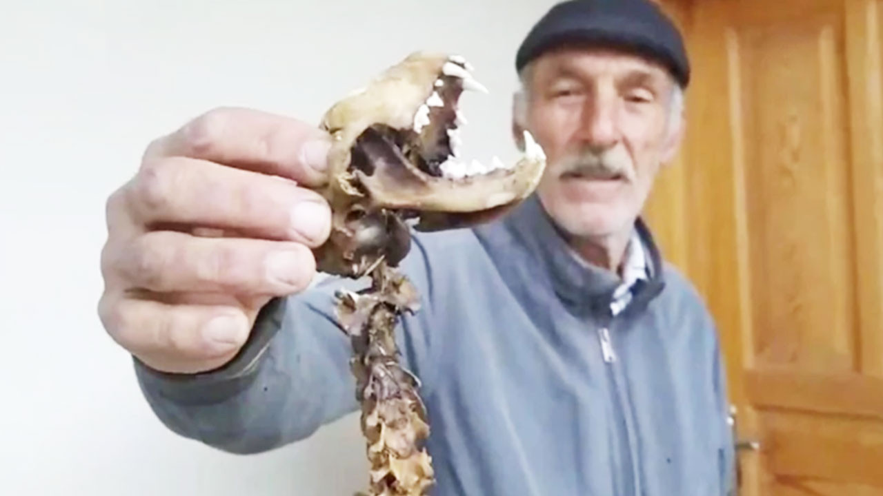Olay Yusufeli ilçesinde yaşandı. İlçeye bağlı Alanbaşı köyünün eski muhtarı Yavuz Turan, ahırındaki malzemelerin üzerini örttüğü naylonların arasında yırtıcı dişlere sahip, 55 santimetre boyunda hayvan iskeleti buldu.