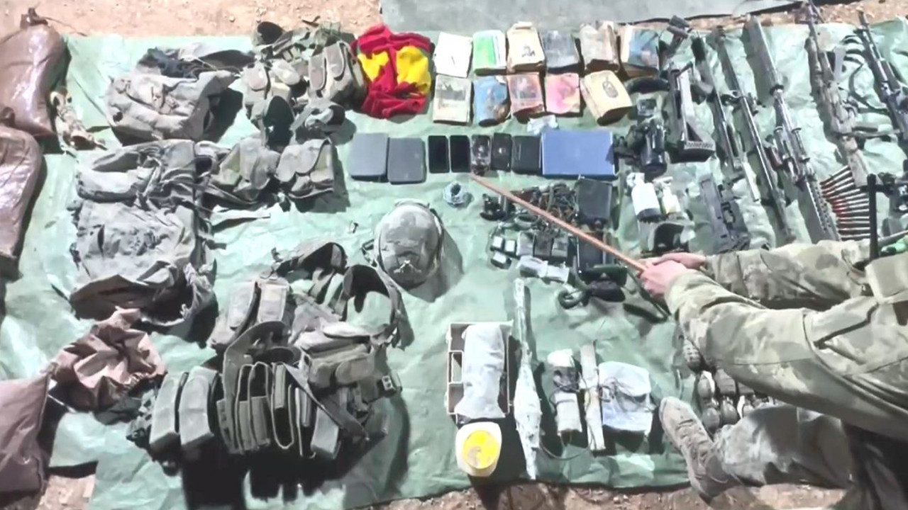 "7 adet AK-47 seyyar dipçik piyade tüfeği ve 19 şarjörü, 1 adet AK-47 sabit dipçik piyade tüfeği, 1 AT-4 tanksavar silahı, 1 RPG-7 roketatar, 1 Dragunov keskin nişancı tüfeği, 3 adet M-16 piyade tüfeği, 1 PKMS makineli tüfek ve yedek namlusu, 29 adet 12,7 milimetre Doçka mühimmat, 682 adet 5,56 milimetre mühimmat, 34 el bombası, 1 keskin nişancı dürbünü, 2 termal silah dürbünü, 1 periskop, 1 RPG-7 gündüz görüş dürbünü, 2 sabit telsiz, 3 el telsizi, 2 dizüstü bilgisayar, 2 Kindle, 4 telefon, 3 kamera, go-pro kamera, Doçka silahına ait parçalar, 5 fünye, el jeneratörü ve terör örgütüne ait dokümanlar."