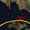 Sarı çizgi Samos kuzeyinden geçiyor. Kuşadası Körfezi'nde olan ve depremi yaratan fayların etkisi. Kırılan Samos Adası Kuzeyu Kenar fayı ve Kuşadası Körfezi'ni açan sıyrılma ana fay. İzmir bloğunda kuzey ve güney gidişli yanal faylar var kırmızılar. 1968'de Körfez'de kırılan ve İzmir'i yıkan, İzmir'İn kuzey kenarındaki fay hattı.