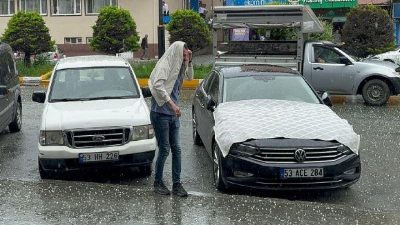 Dolu yağışı nedeniyle park halindeki araçlarının kaportalarında göçük olmasını engelelem için adeta zamanla yarıştı. Ellerine geçen halı, kilim, bez gibi ürünleri araçlarının üzerine sererek kaportalarını korumaya aldı.