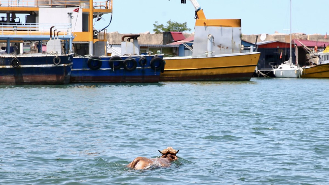 Yolda bir süre de trafiğin ters istikametine ilerleyen kurbanlık, daha sonra Kumyalı Balıkçı Barınağı'ndan denize atladı.