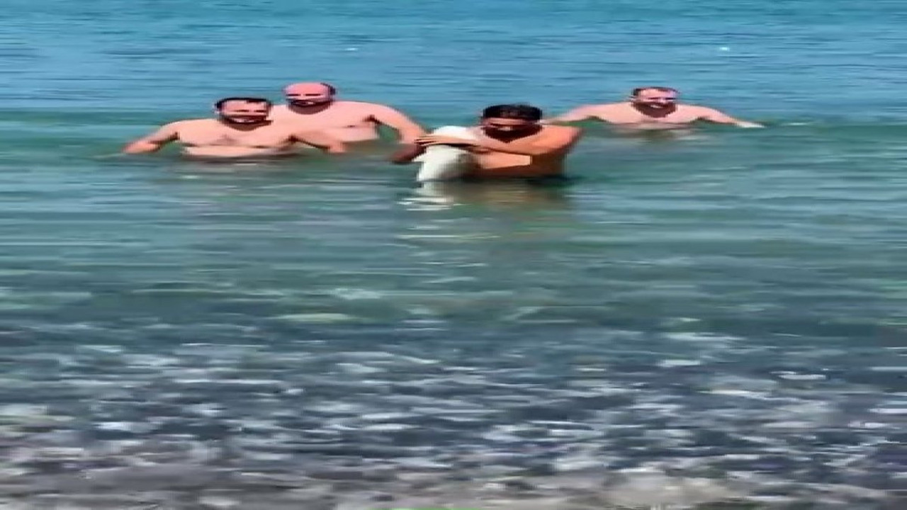 Sahile çıkarak yakaladığı balıkla poz veren Hacıoğulları'nın bu anları, cep telefonu kamerasıyla kaydedildi.
