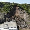 Heyelanın etkisiyle yüzlerce ton dev kaya toprak ve ağaçları da sürükleyerek yere doğru kaydı. Dev kayaların karayoluna doğru ilerlemesini ise alanda bulunan eski düğün salonunun binası engelledi.