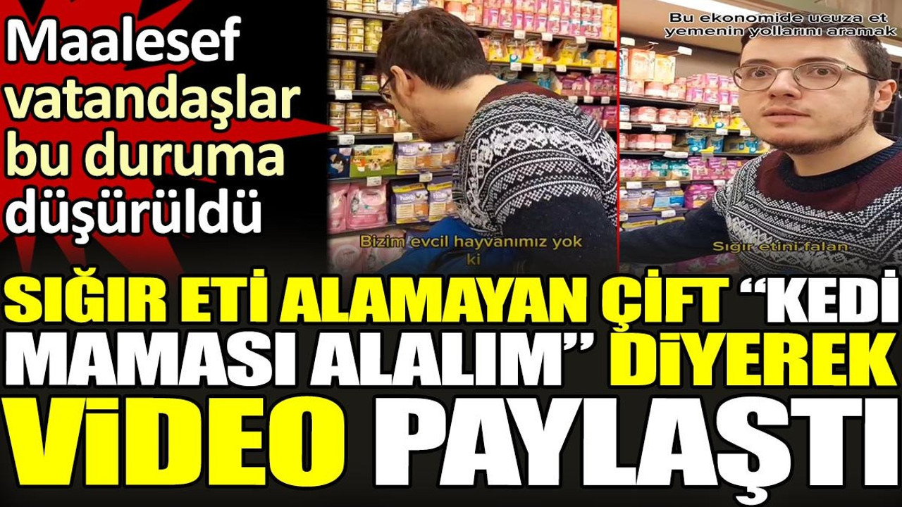 Sosyal medyada paylaşılan bir videoda, alışveriş için markete giden bir çift, artan et fiyatları nedeniyle kedi maması almak istedi. Sığır eti alamayan çift, sığır etinden yapılan bir mamayı rafta görünce, ”Mamanın üzerinde sığır eti diyor. Bu fiyata nerede bulacaksın sığır etini? Alalım işte deneyelim. Pilavın üzerine koyar yeriz” ifadelerini kullandı.