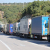 İhracat yükü taşıyan yaklaşık 800 TIR, Hamzabeyli Sınır Kapısı önünde yurt dışına çıkmak için işlemlerinin tamamlanmasını bekliyor.