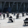 Önlem olarak açık havada düzenlenen sınav için yüzlerce kişi, maske takarak bir üniversitenin kampüsünde açık havada sınava girdi.