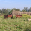 Sabah saatlerinde otlanan 7 yılkı atına , sokak köpekleri de eşlik etti.