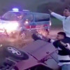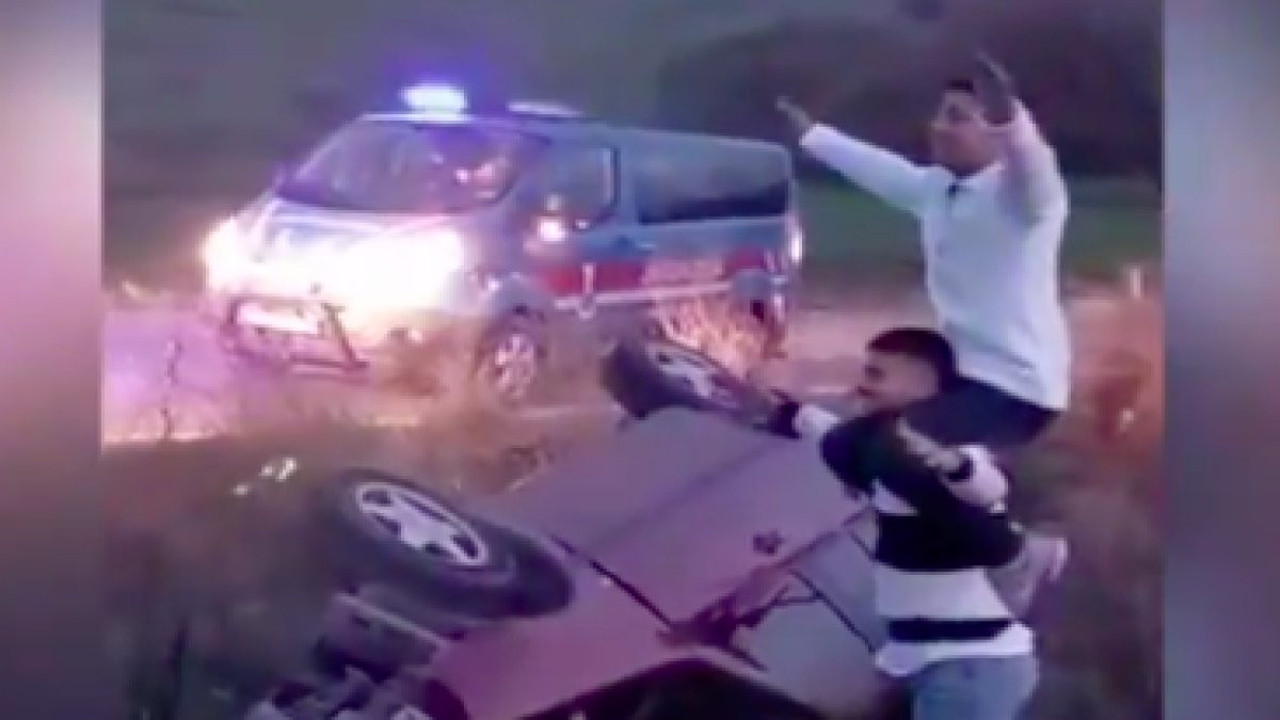 Tekirdağ'da takla atan aracın içinden herhangi bir yara almadan kurtulan gençler pert olan arabanın yanında kutlama yaptı