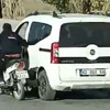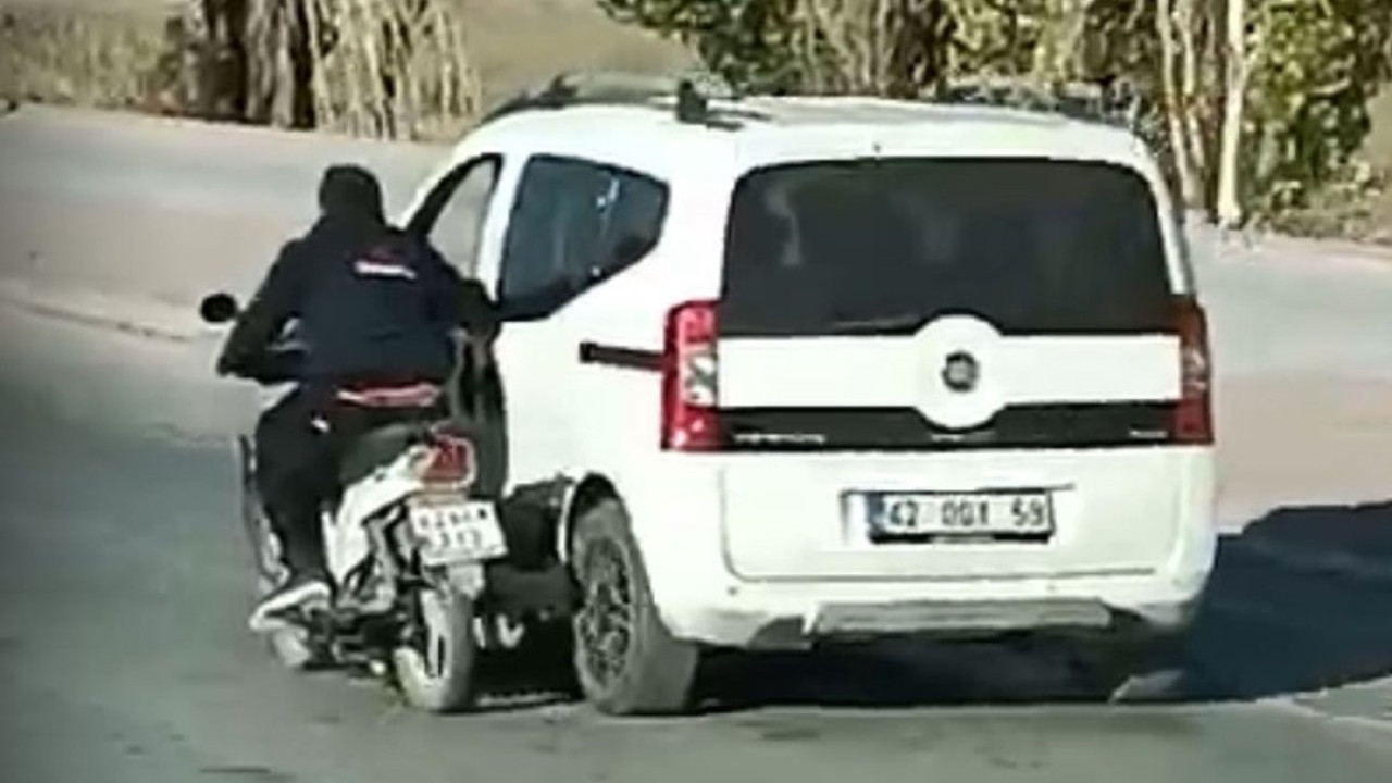 Karatay ilçesi Adana Çevre Yolu Caddesi üzerinde plakası belli olmayan bir motosiklet sürücüsü, bir hafif ticari aracın sürücü kısmındaki açık olan camdan kapıya tutundu.