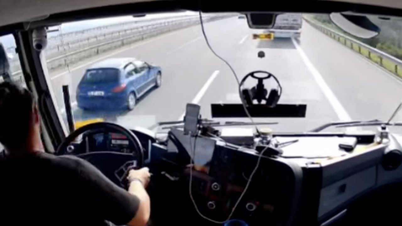 Otoyolda telefona dalarak ilerleyen bir tır şoförü, çarpışma önleyici sistemin uyarısıyla son anda yavaşlayıp sola kırarak olası bir faciadan döndü. Araç kamerasına yansıyan görüntülerde, tırın ilerlediği ve sol şeridin boş olması sayesinde çarpışmayı önlediği anlar gözler önüne serildi.