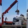 Manda, diğer sürücülerin meraklı bakışları arasında vinçle dorseye konuldu.
