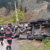 Trabzon’un Araklı ilçesinde kontrolden çıkıp devrilen asfalt yüklü tankerin sürücüsü ile yanındaki kişi yaralandı.
