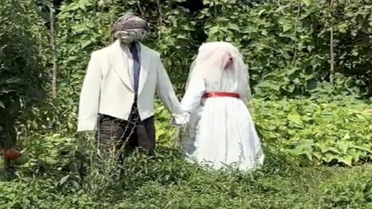 Trabzon’da bir vatandaş, bahçesinde dikkat çekici bir dekorasyon çalışmasına imza attı. Evinin bahçesine yerleştirdiği gelin ve damat figüründeki korkuluk, bölge halkı ve sosyal medya kullanıcıları tarafından büyük ilgi gördü. Yoldan geçen bir vatandaşın cep telefonu kamerasıyla kaydettiği ve sosyal medyada paylaştığı bu sıra dışı korkuluk, kısa sürede viral oldu.