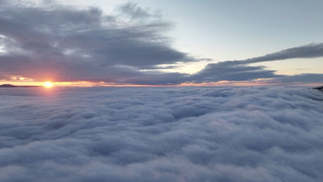 Dronla çekilen görüntülerde, beyaz sis bulutları dağın tepelerini örterek kartpostallık bir görüntü sundu.