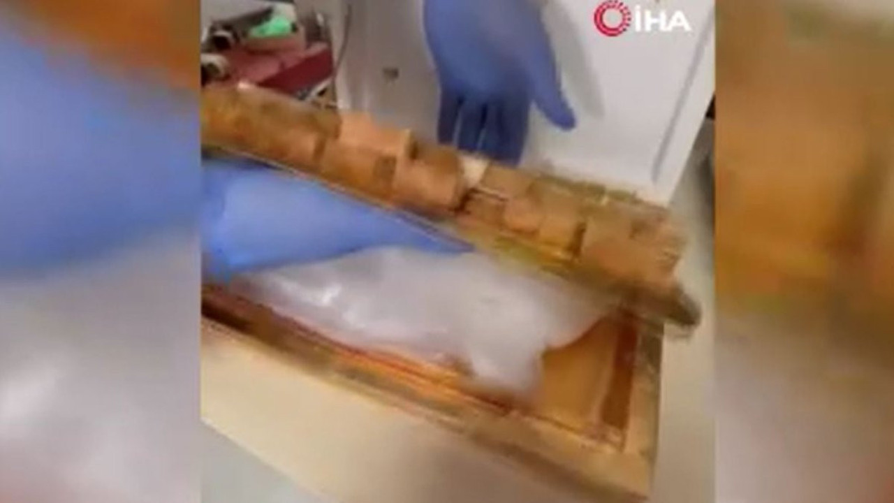 Şahıs üzerinde ve eşyalarında yapılan aramalarda, tatlı kutuların altına gizlenmiş şekilde 1 kilo 500 gram Metamfetamin maddesi ele geçirildi.