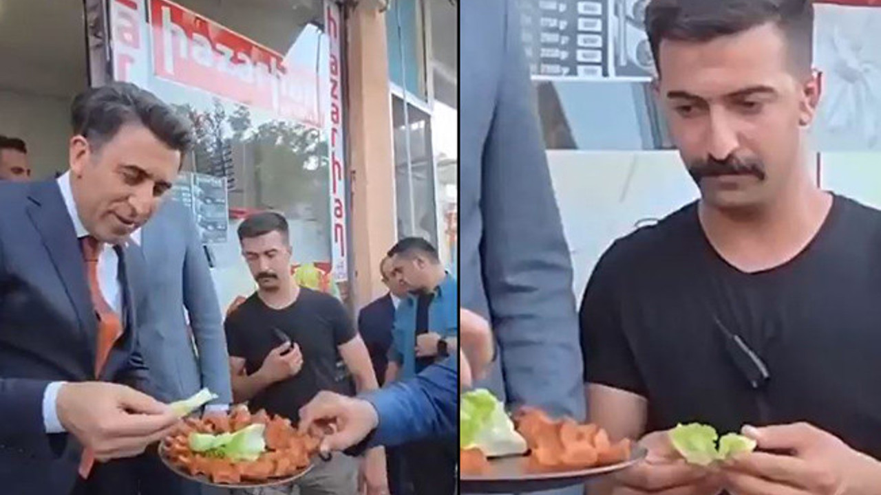 Fakat koruma polis memuruna sadece marul veren Aygöl, içine çiğ köfte koymayı unuttu. O anlar kameraya yansırken, polis memurunun yüz ifadesi ve çevresindekilerin gülümsemesi anbean kameraya yansıdı.