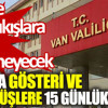 olmak üzere (15) gün süre ile; Valilik ve Kaymakamlık makamlarınca uygun görülenler hariç olmak üzere, 2911 Sayılı Toplantı ve Gösteri Yürüyüşleri Kanunu hükümlerine göre düzenlenecek gösteri yürüyüşü, açık hava toplantıları ve kapalı yer toplantılarının 2911 Sayılı Kanunun ilgili hükümlerine istinaden YASAKLANMASI,