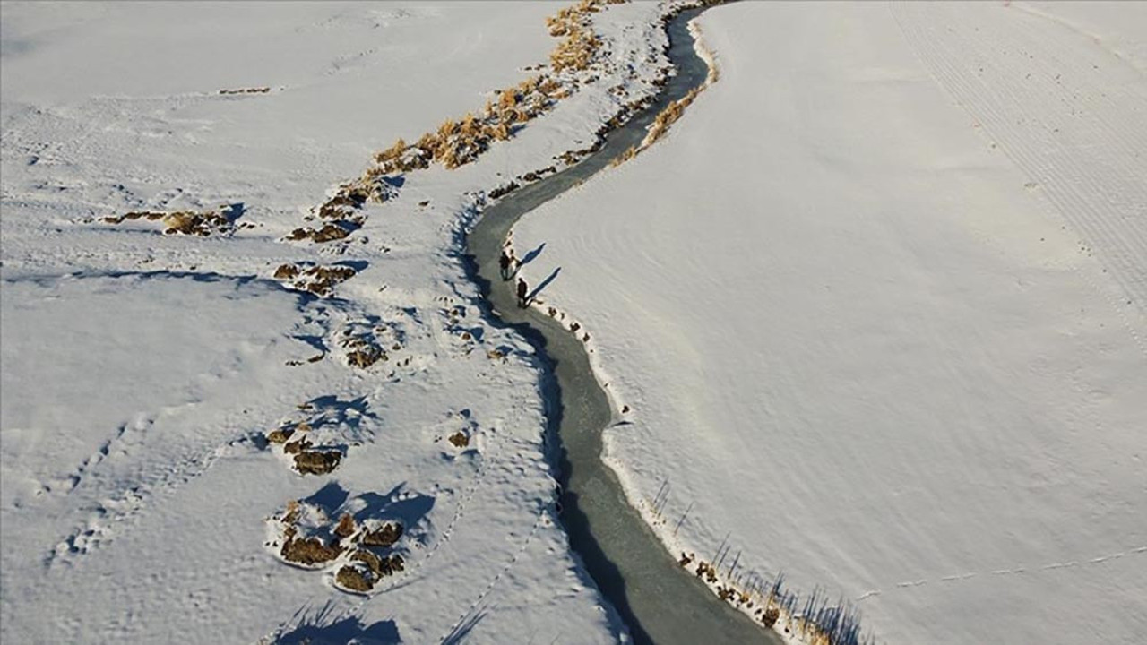 Kar örtüsünün arasında doğanın kılcal damarları gibi kıvrılan menderesler, dron ile görüntülendi.