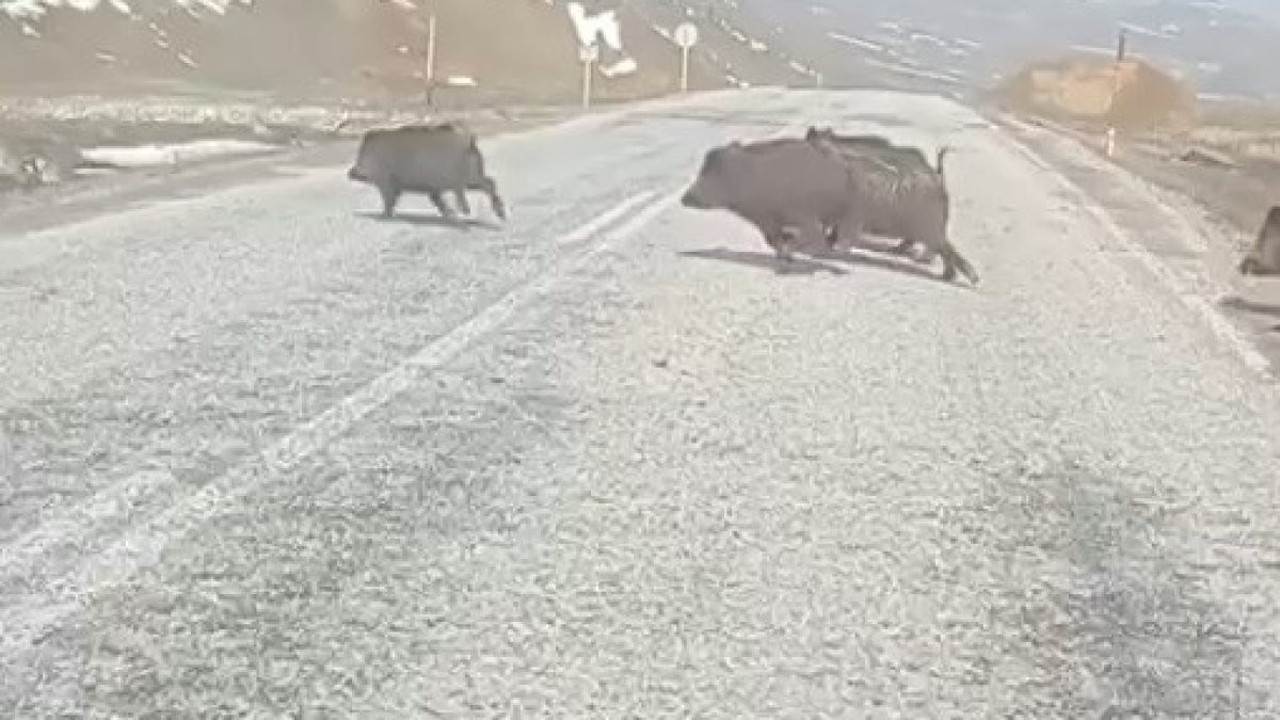Varto ilçesine doğru seyir halindeki araç sürücüsü Veysel Alçin adlı bir vatandaş, cep telefonu kamerasıyla bu ilginç anları kaydetti. Alçin'in görüntülerinde, bir arada bulunan yaklaşık 10 domuzun bölgede dolaştığı görülüyor.