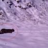 Yaban kedisi, karla kaplı ormanda ve yağmur altında yolda yürürken görüntülendi.
