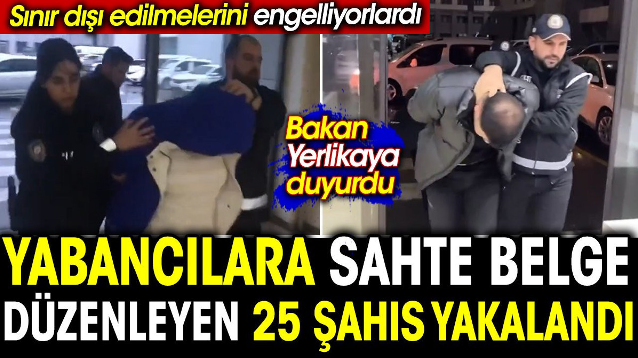 İçişleri Bakanı Ali Yerlikaya, Türkiye’de yasal kalış izni olmayan yabancı uyruklu şahıslara sahte belge düzenleyerek sınır dışı edilmelerine engel oldukları tespit edilen 1’i doktor, 3’ü Noter görevlisi, 5’i danışmanlık şirketi sahibi ve 1’i Posta görevlisi olmak üzere 25 şüpheli şahıs, KALKAN-14 isimli operasyonlar sonucunda yakalandı.
