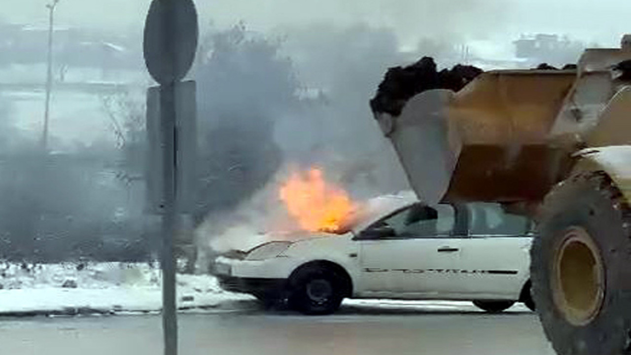 Sürücü, otomobili durdurup inerek itfaiyeye haber verdi. Bu sırada bölgede çalışma yapan bir iş makinesinin operatörü, alevlere toprak döktü.