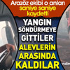 Alevlerin ortasında mahsur kalan yangın söndürme ekibinin öncelikle kendileri olmak üzere tankeri de ateşten koruması saniye saniye kaydedildi.