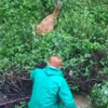 Hemen bölgeye gelen Arhavi Belediyesi'ne bağlı itfaiye ve zabıta ekipleri, geyiği kurtarmak için çalışma başlattı. Su kanalına inen 2 görevli, sessizce yaklaşıp, geyiği yakaladı.