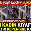 O anlar ise güvenlik kamerasına saniye saniye yansıdı. Kadın en tepeye kadar yükseldi. Bu sırada kadının pazar arabasını elinden bırakmadığı da görüldü. Market çalışanları kadının kepengle birlikte yükseldiğini görünce hemen olaya müdahale etti. Yaşlı kadın kurtarıldı ve takıldığı kepenkten indirildi.