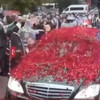 Meclise onlarca motosikletli polis eşliğinde giden Erdoğan’ın makam aracına meclis girişinde kova kova gül döküldü.