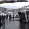 Edinilen bilgilere göre, olay, Altınay Caddesi''nde yaşandı. Antalya''ya set malzemeleri taşımak için yüklenen kamyonetin freni boşaldı. Karla kaplı yokuşta kaymaya başlayan kamyonet, caddeye çıkarak devrildi.