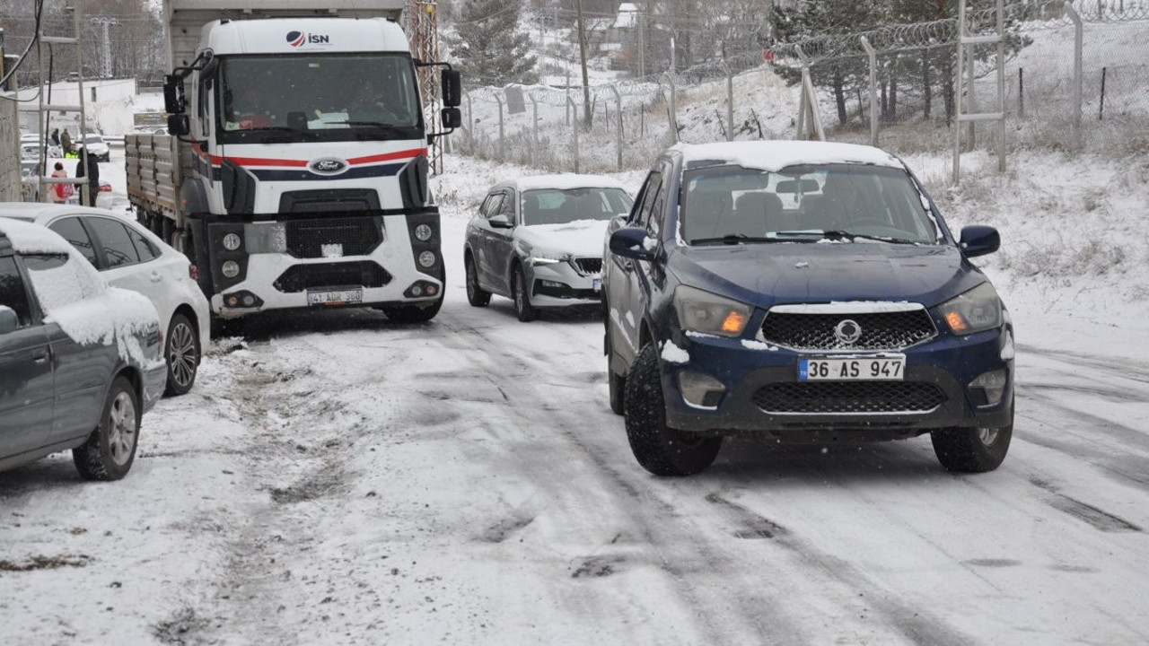 Kars’ta kar yağışı hayatı olumsuz etkilemeye başladı. Sabah erken saatlerde görev yerlerine gitmek üzere servis ve şahsi araçlarıyla yola çıkan öğretmenler ve vatandaşlar, Çakmak köyü yolu yokuşunu çıkamadı.